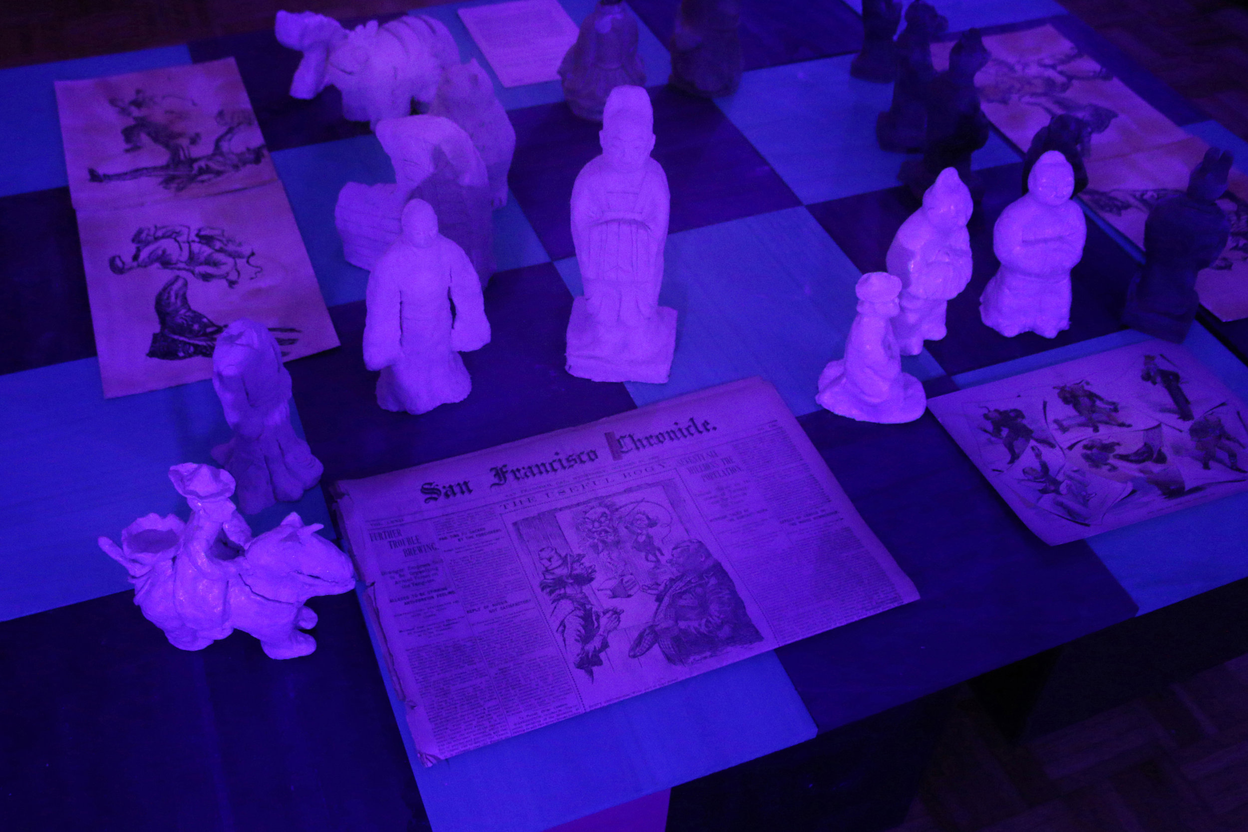 Media: clay, newspapers, pen on paper, wood, LED lights